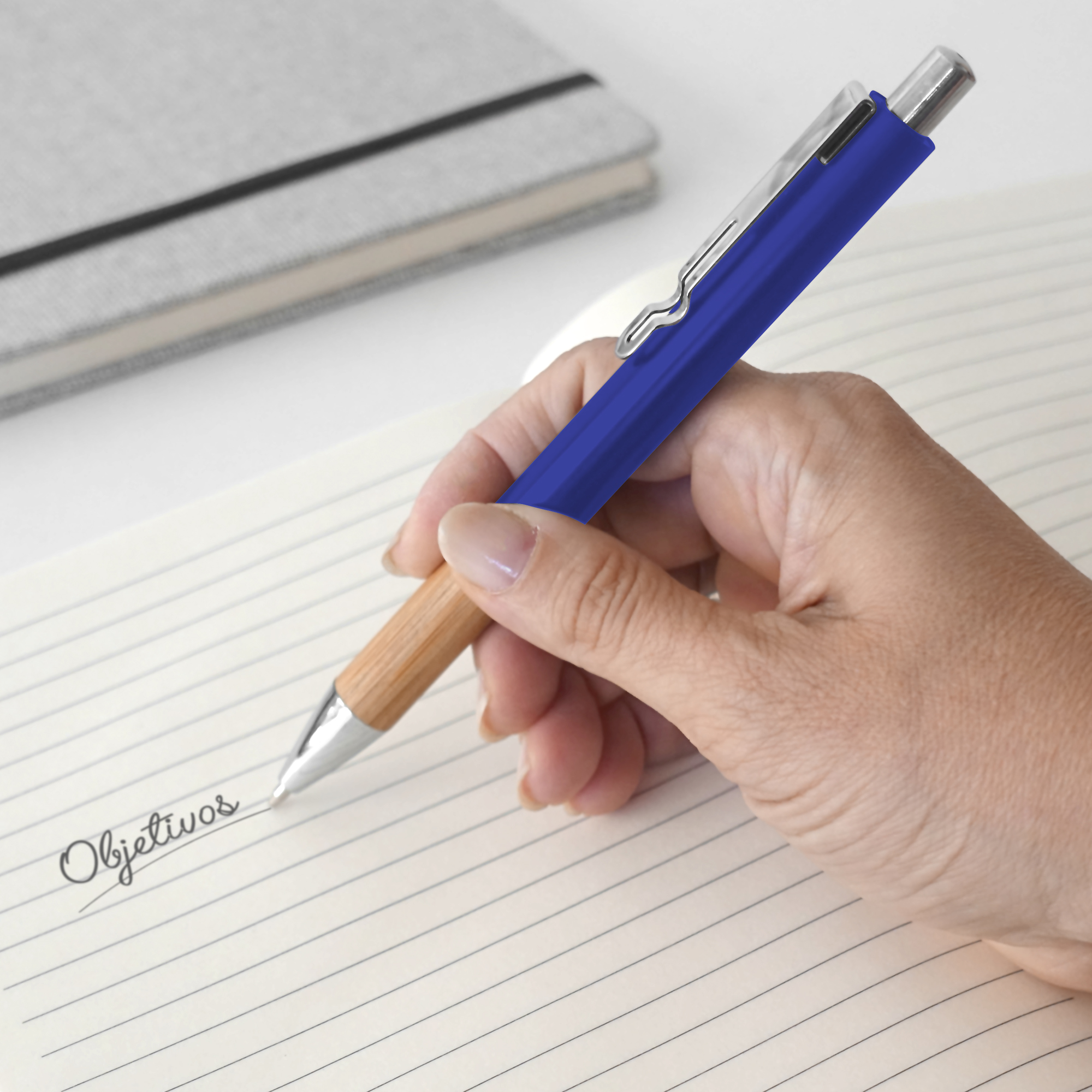 Económico y de gran presencia, Bolígrafo cuerpo aluminio y grip de bambú. Clip metálico. Pulsador y puntera plásticas color plata. Tinta negra.