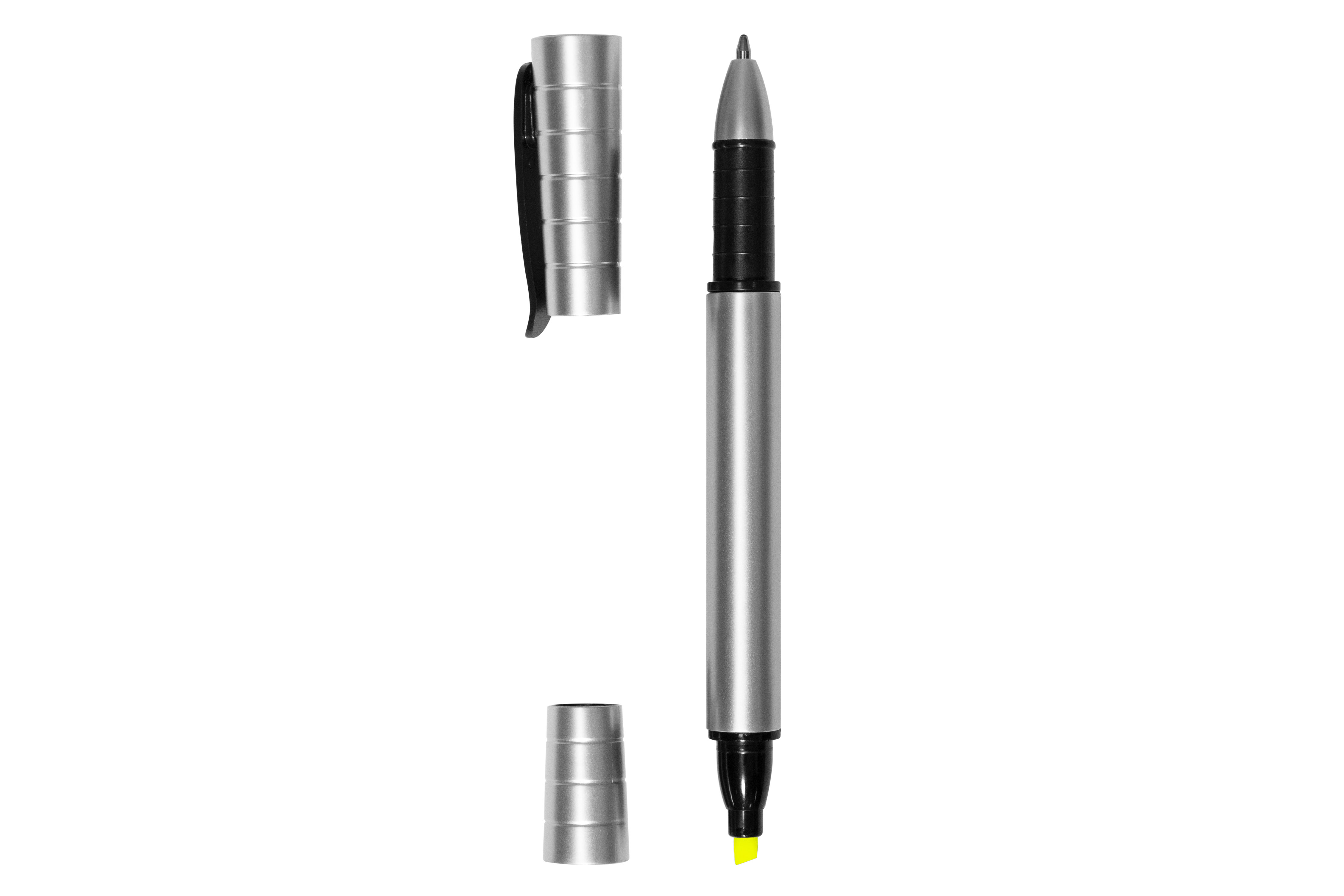 Resalta tus ideas con este innovador boligrafo. Cuerpo plateado plástico, Detalles en color negro. Resaltador fluo amarillo. Tinta negra. con tapa. Logo serigrafía.