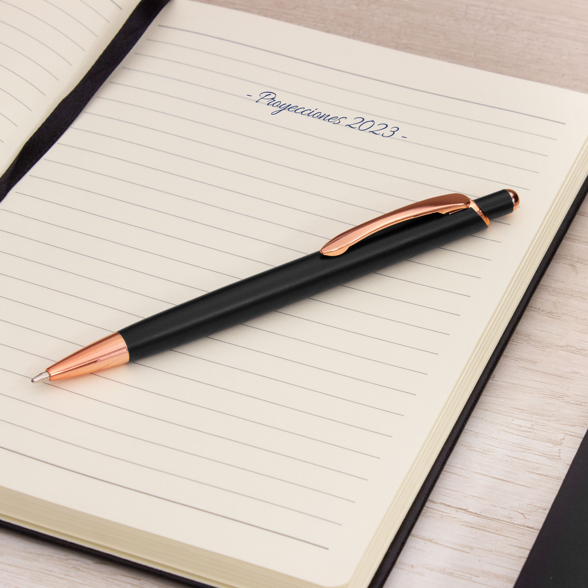 Metal. Cuerpo de aluminio, rubber finished color negro, muy suave al tacto. Bolígrafo retráctil. Clip, puntera y detalles metálicos color cobre. Tinta azul o negra.
