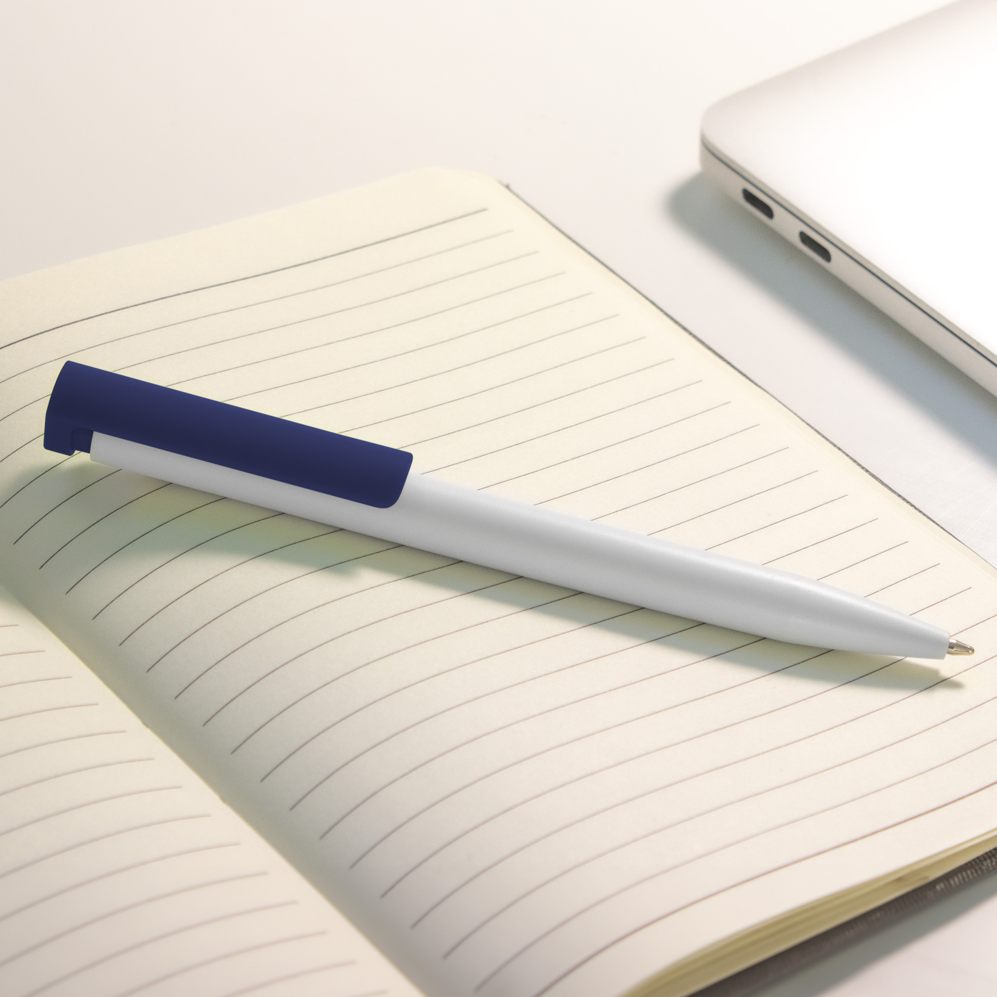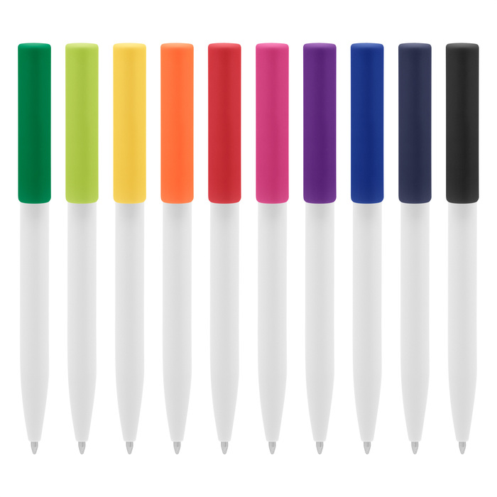 Producto promocional altamente efectivo. Plástico. Cuerpo blanco y clip de diferentes y llamativos colores, ideal para destacar su logo. Bolígrafo retráctil. Tinta negra. Sistema de botón push. Amplia área de impresión.