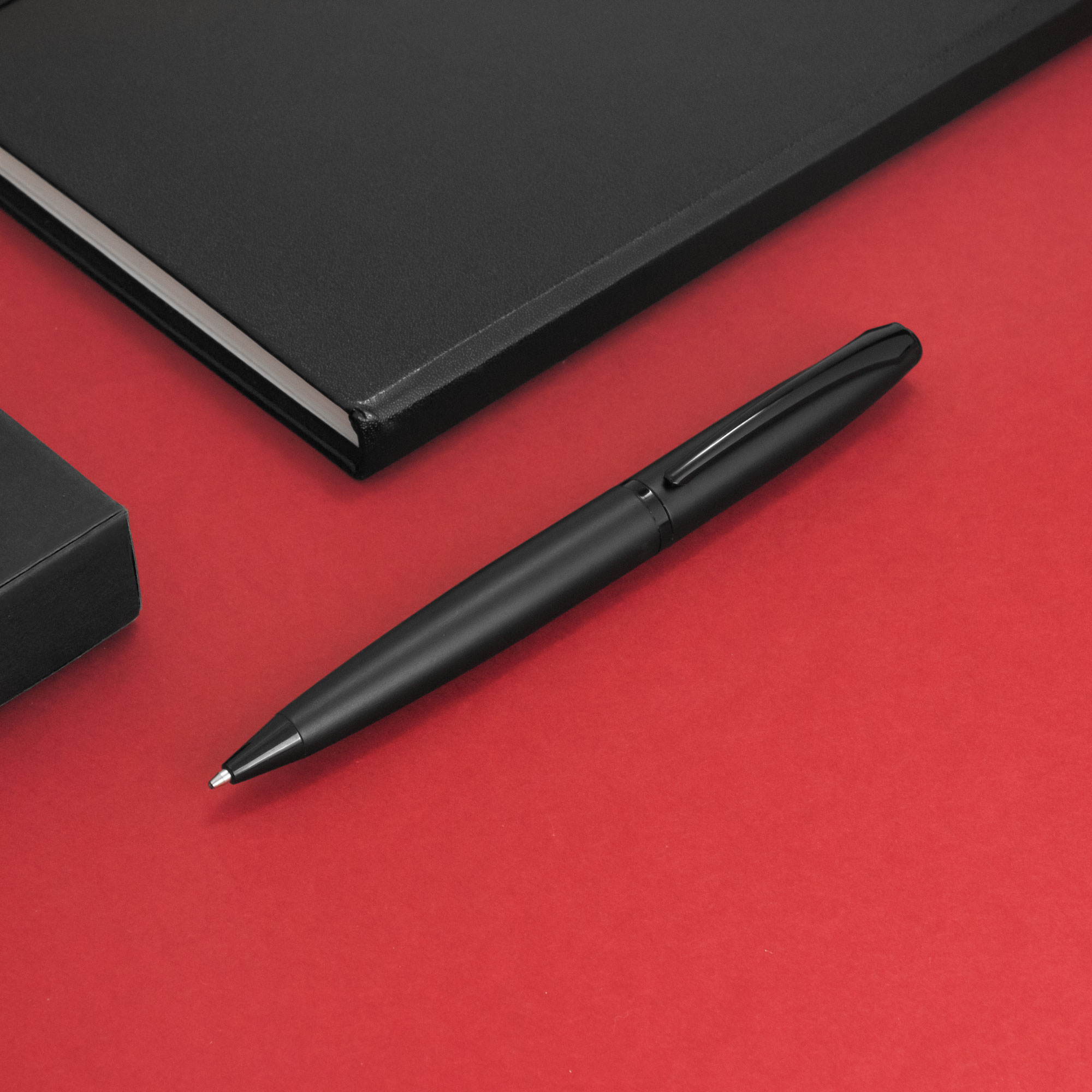 Confiable y cómodo articulo corporativo, bolígrafo metálico. Cuerpo de aluminio con acabado mate. Clip, anillo central y puntera de hierro con acabado brillante. Refill metálico de origen alemán. Tambor superior con revestimiento galvánico. Apertura giratoria. Tinta azul. Presentación en caja de regalo.