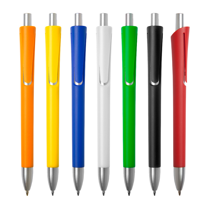 Bolígrafo con cuerpo plástico de color, botón pulsador y puntera color plata. Disponible en tinta negra y azul. Regalo promocional con tu marca o logo.