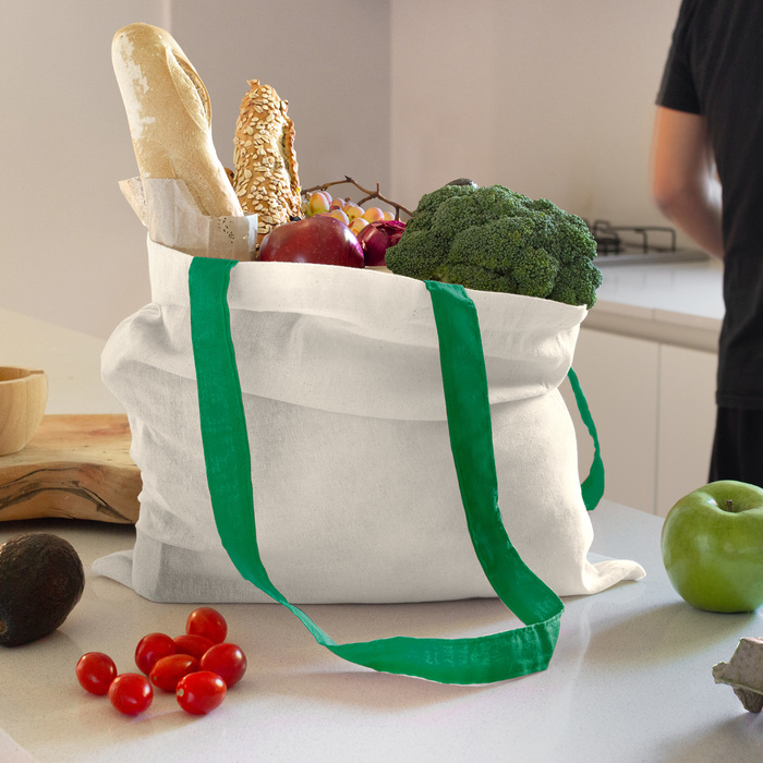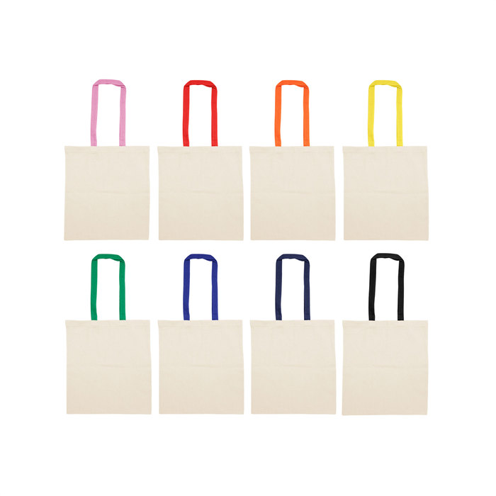 Bolsa reutilizable color natural con asas de diferentes colores. Asas cosidas de 70cm x 2,5 cm.