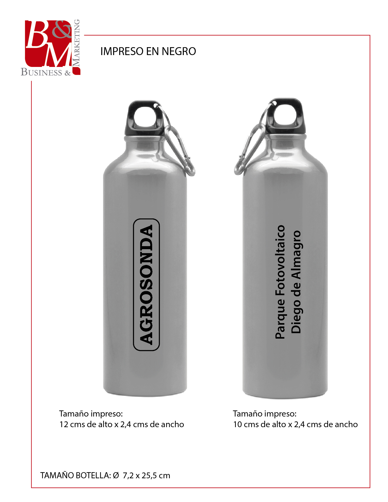 Impresión serigrafia ambos lados botella aluminio 750 cc. Gran superficie para exhibir tu logo o marca.