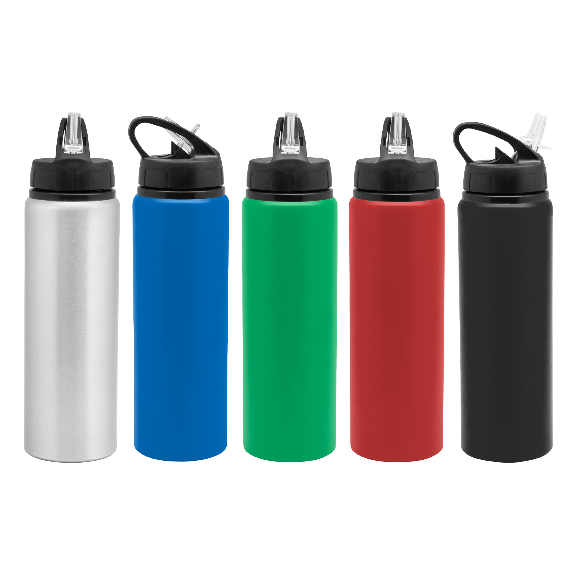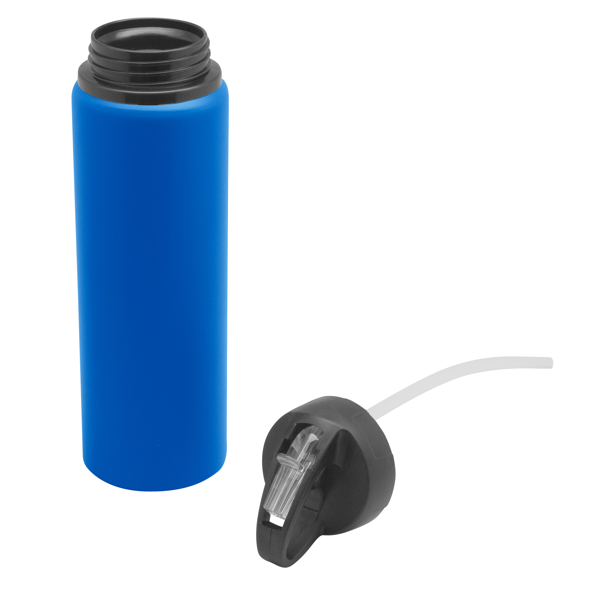 Botella Ø 7 x 25 cm. Capacidad 800 ml. Botella de aluminio con manija de agarre en la tapa y sorbete plástico. Tapa a rosca de plástico.