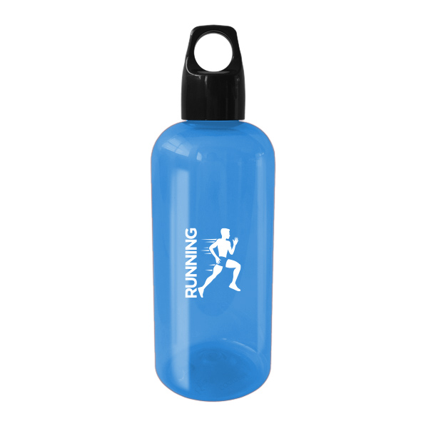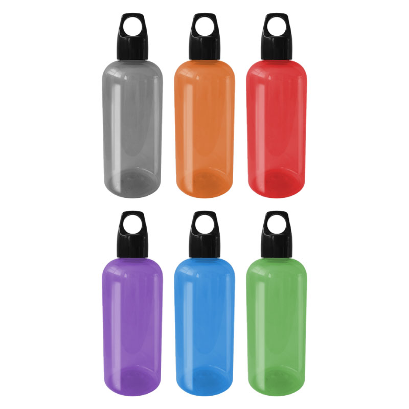 Tamaño Ø 7 x 20 cm. Material PET. Botella de Plástico. Extra liviana, Capacidad 540 ml. Botella de color con tapa a rosca en color negro, agujero en el centro para ser transportada o colgar mosquetón. El peso completo de la Botella con su tapa es de 50 grs. (39 grs Botella, 11 grs tapa)