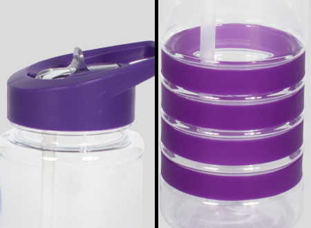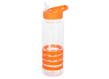 Botella deportiva modelo «Tritan», de plástico rígido traslúcido con 4 anillos de silicona de color. Tapa de plástico PP de color con bebedero retráctil. Incuye bombilla plástica en el interior. Para líquidos fríos (no térmico). Colores : azúl, rojo, morado, naranja, negro.