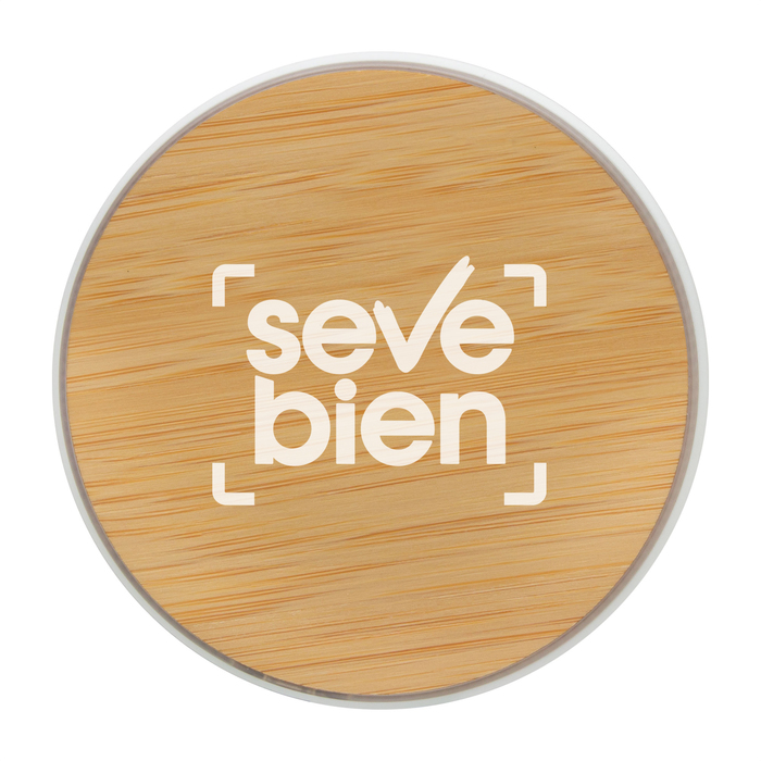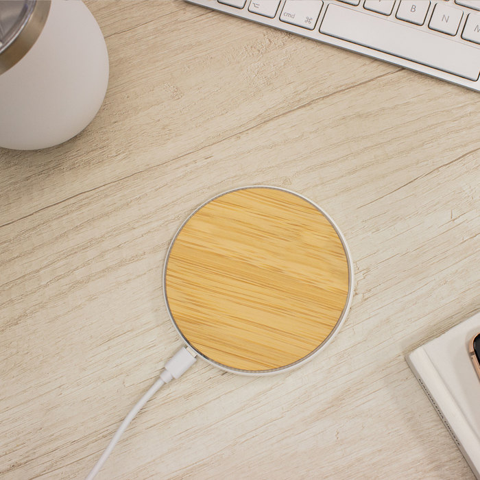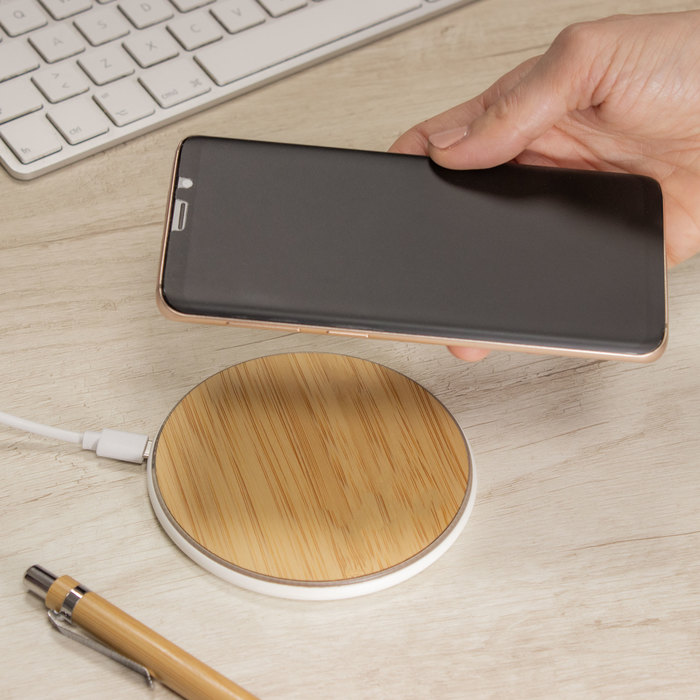 Bambú + Plástico ABS. Cargador inalámbrico. Base plástica color blanco con antideslizantes. Entrada: 5V/2A, 9V/1.1A. Salida: 10 watts. Distancia de transmisión: <=8 mm. Eficiencia de Carga: >=73%. Control de temperatura. Detección de objetos extraños. Luces indicadoras de carga. Cable de carga USB-C en color blanco de 50 cm de largo. Presentación en caja de regalo kraft. Medidas 10 x 0,9 cm.