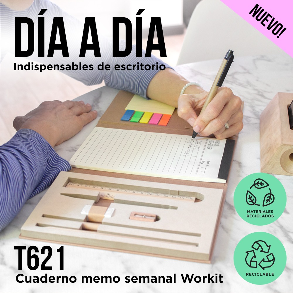 Tamaño 15 x 21 x 2.4 cm. Hecho en cartón kraft de gran firmeza. Cuaderno anotador ecológico múltiples recursos. Block 40 hojas con fecha y dia de la semana. Contiene, regla PVC, regla de madera, dos lápices negros, goma, sacapuntas y lápiz. Post it/stickies de colores para marcar (azul, verde, amarillo, rosa y naranja). cierre banda elástica de color negro que permite una buena sujeción.