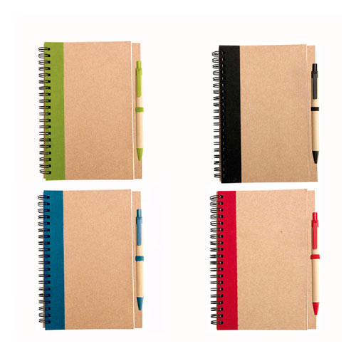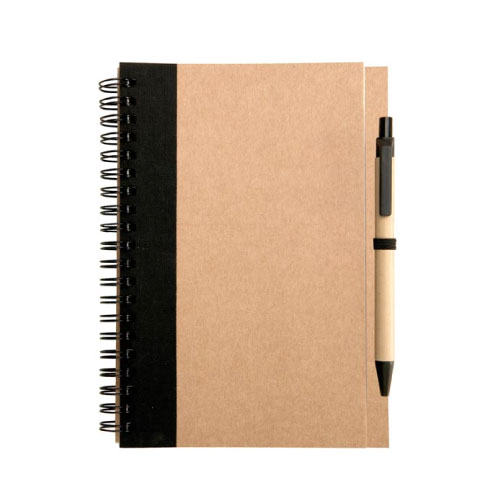 Cuaderno Ecológico grande (tamaño 1/2 oficio) de 50 hojas interiores con tapas de cartón reciclado y anillado doble cero. Incluye Bolígrafo.