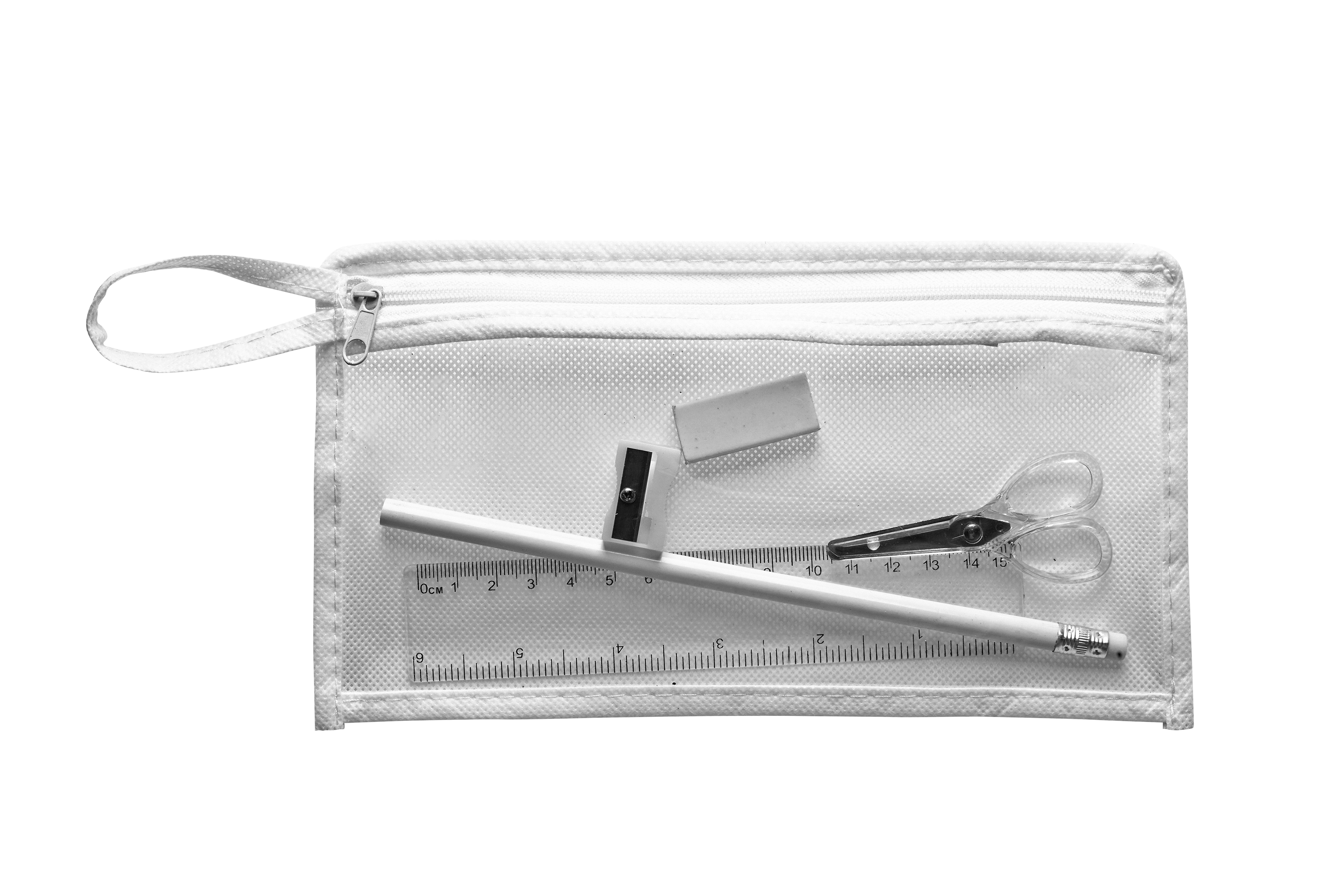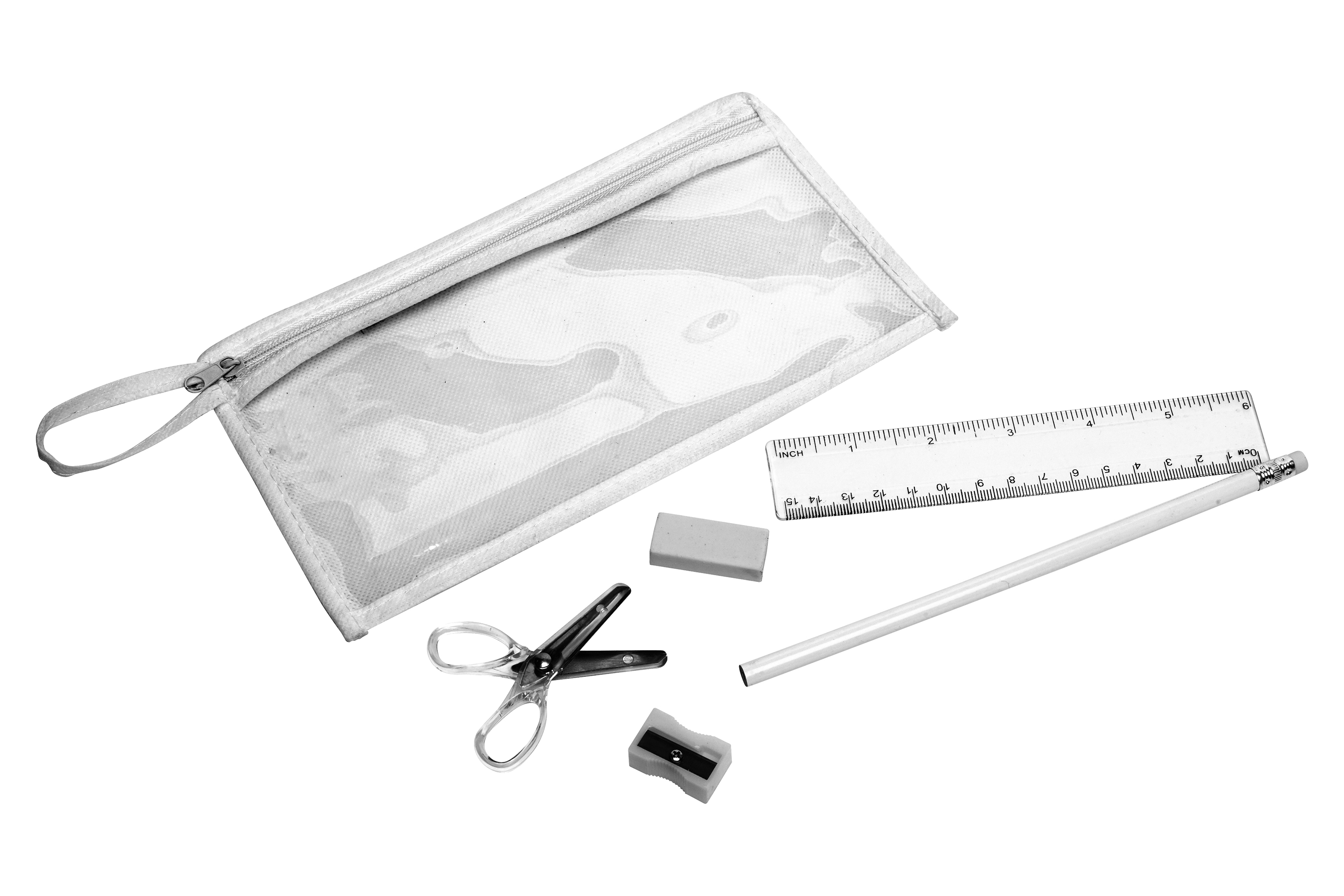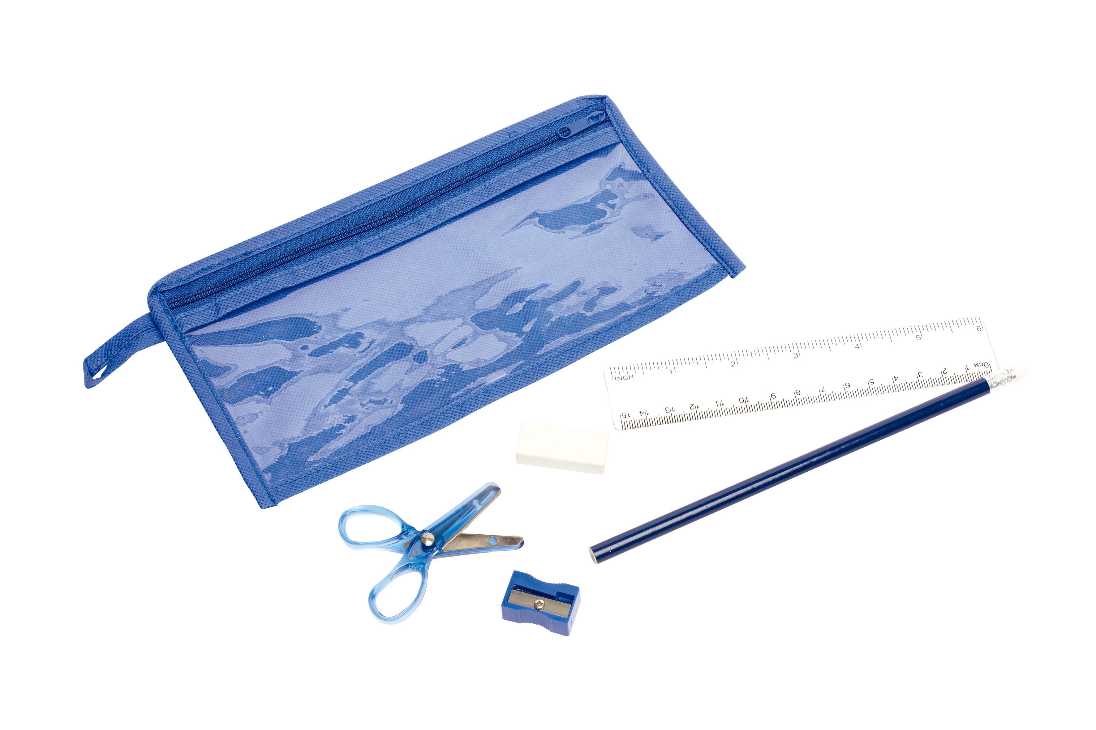 Estuche básico tamaño 22 x 12 cm. PVC y non-woven. incluye regla plástica, goma de borrar, lápiz negro, sacapuntas y tijeras.