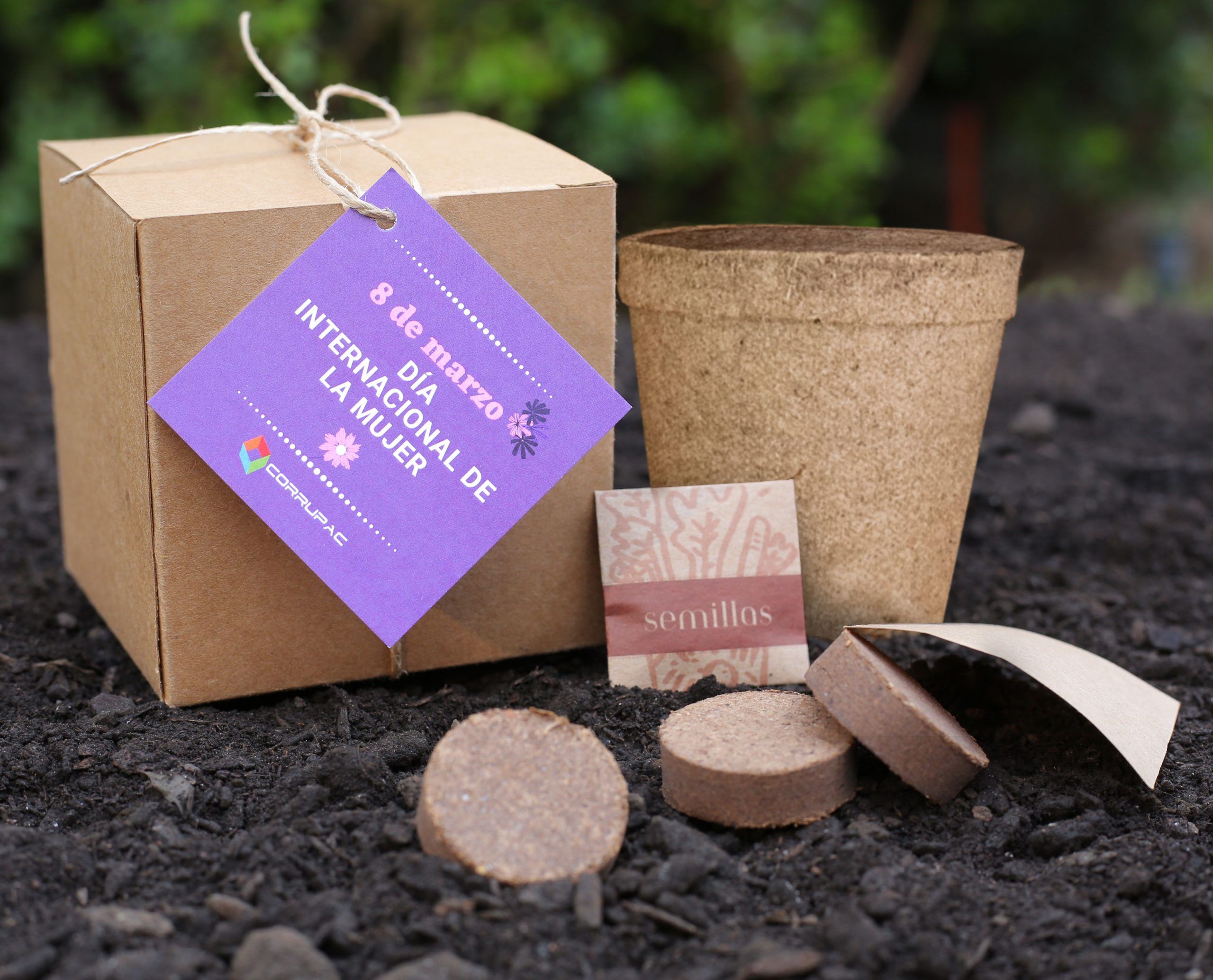 Kit de siembra y cultivo con un macetero de turba natural de 8 x 8 cm. Incluye tarjetita de saludo 100% personalizada.