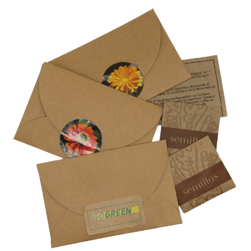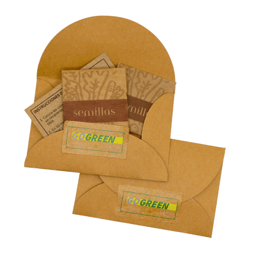 2 sobres papel kraft con semillas (4×4 cm) Variedades según temporada, Estuche presentación formato 9×6 cartulina kraft.