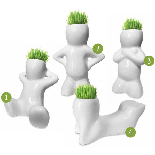 Una figura de cerámica blanca. La cabeza contiene una bolsita con semillas de pasto, listas para regar y crecer.