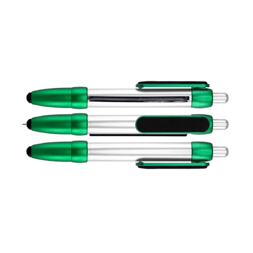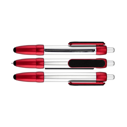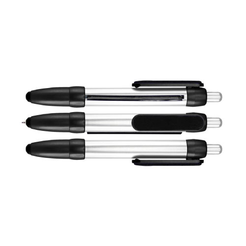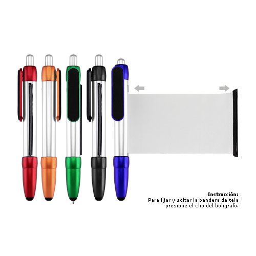 Lápiz plástico cuerpo plata terminales color metalizado, incluye bandera retráctil de tela imprimible, para descripciones, mensajes publicitarios, frases recordatorias, puntero touch, clip gamuzado negro para limpiar pantallas táctiles.
