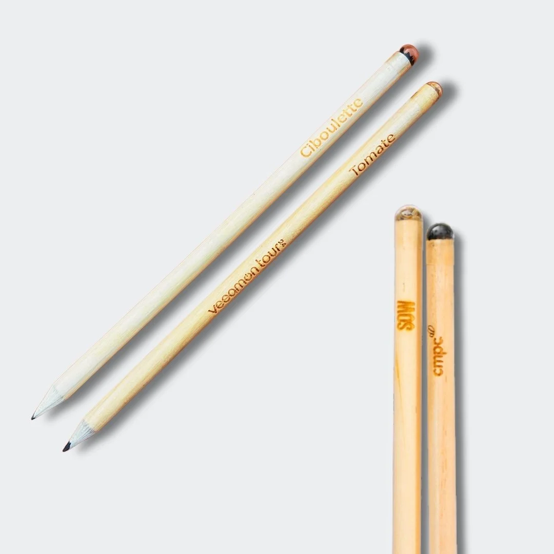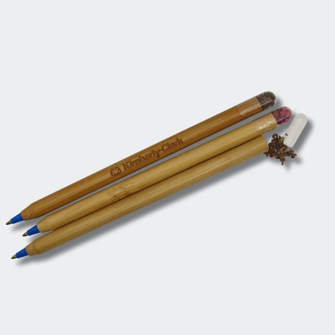 Bolígrafo ecológico con semillas : formatos lápiz pasta cuerpo de bamboo y lápiz grafito plantable cuerpo en madera natural, Incluye cápsula biodegradable con semillas, variedades según temporada. Nombre de la semilla y su logo con grabado laser.