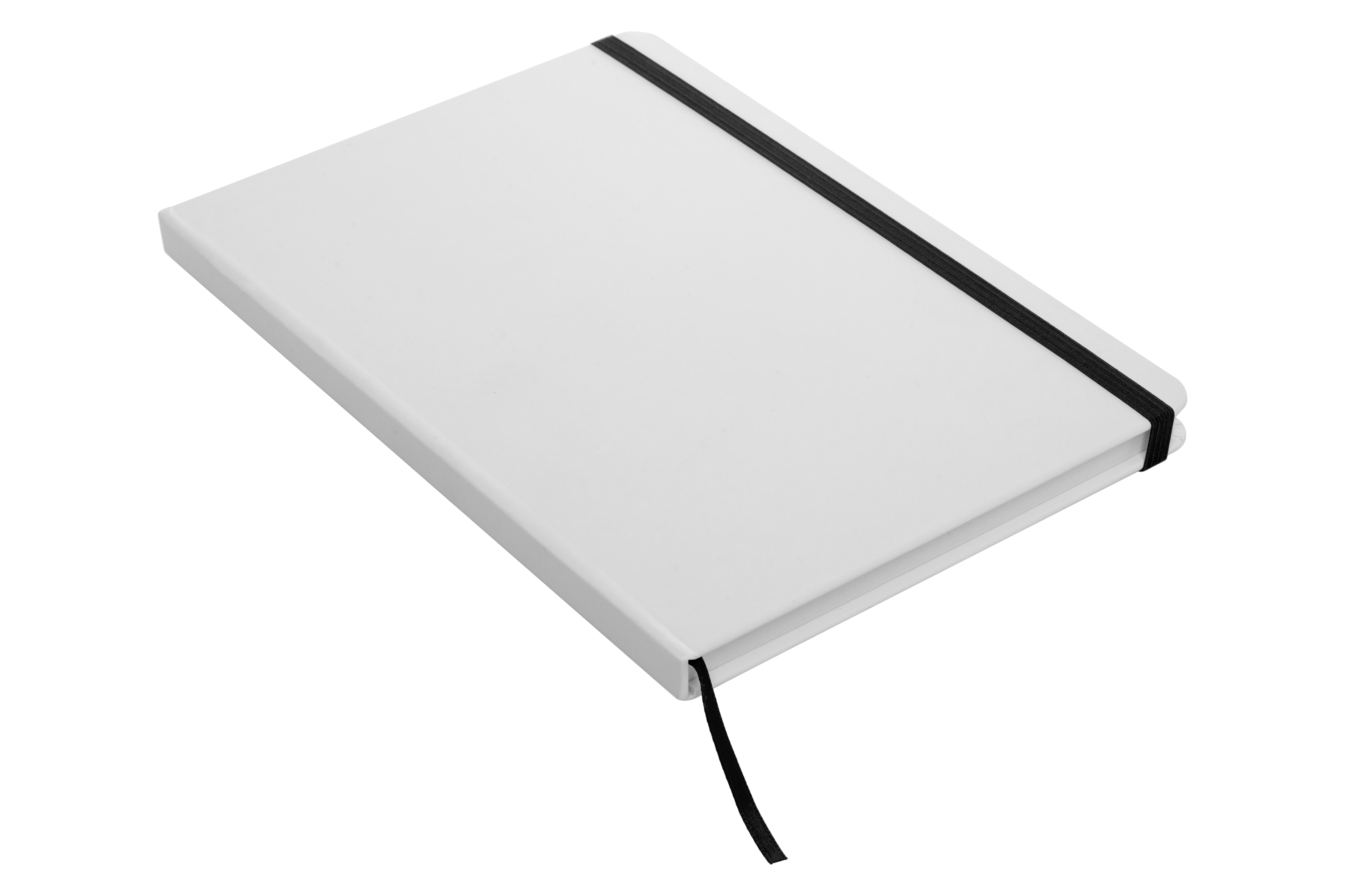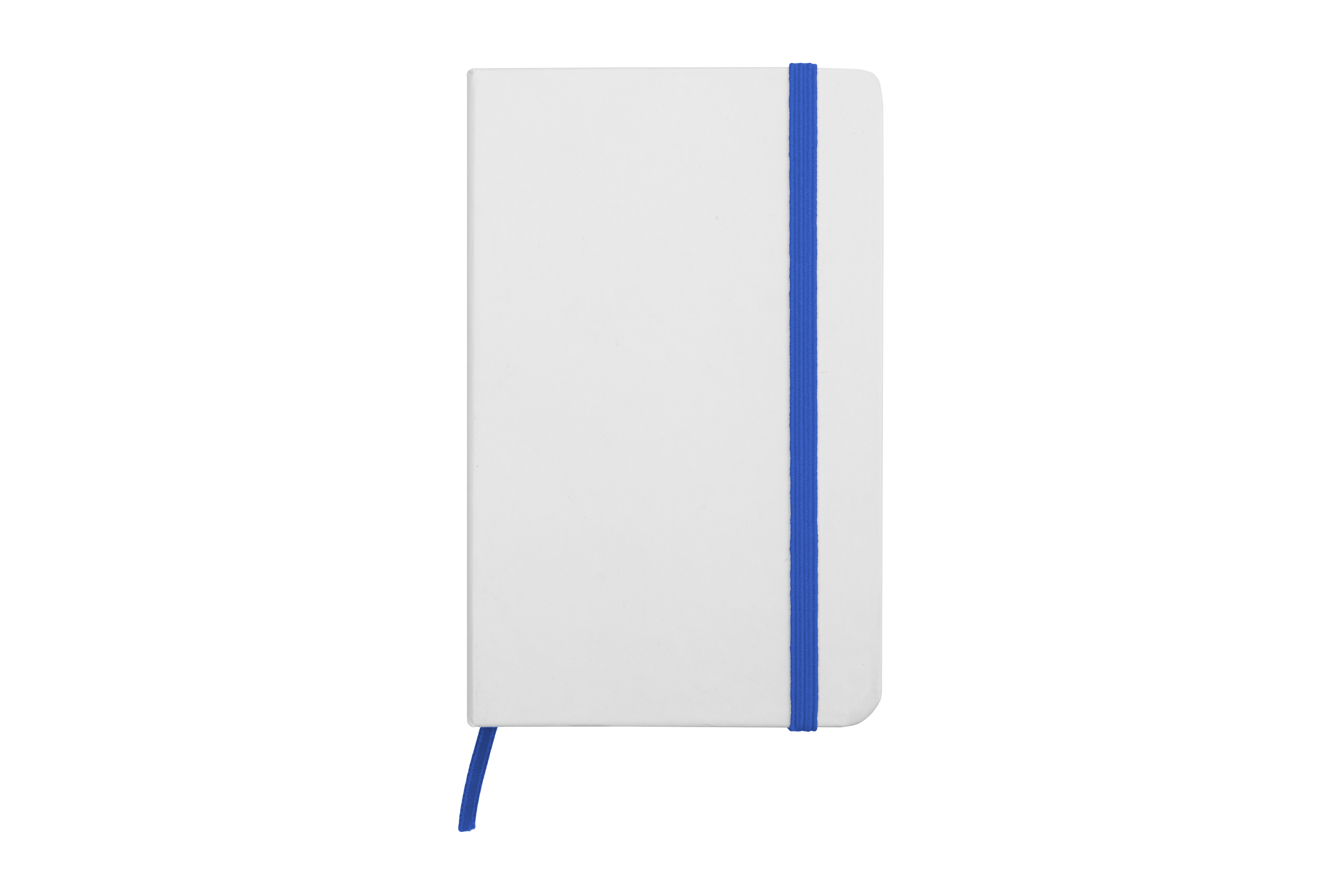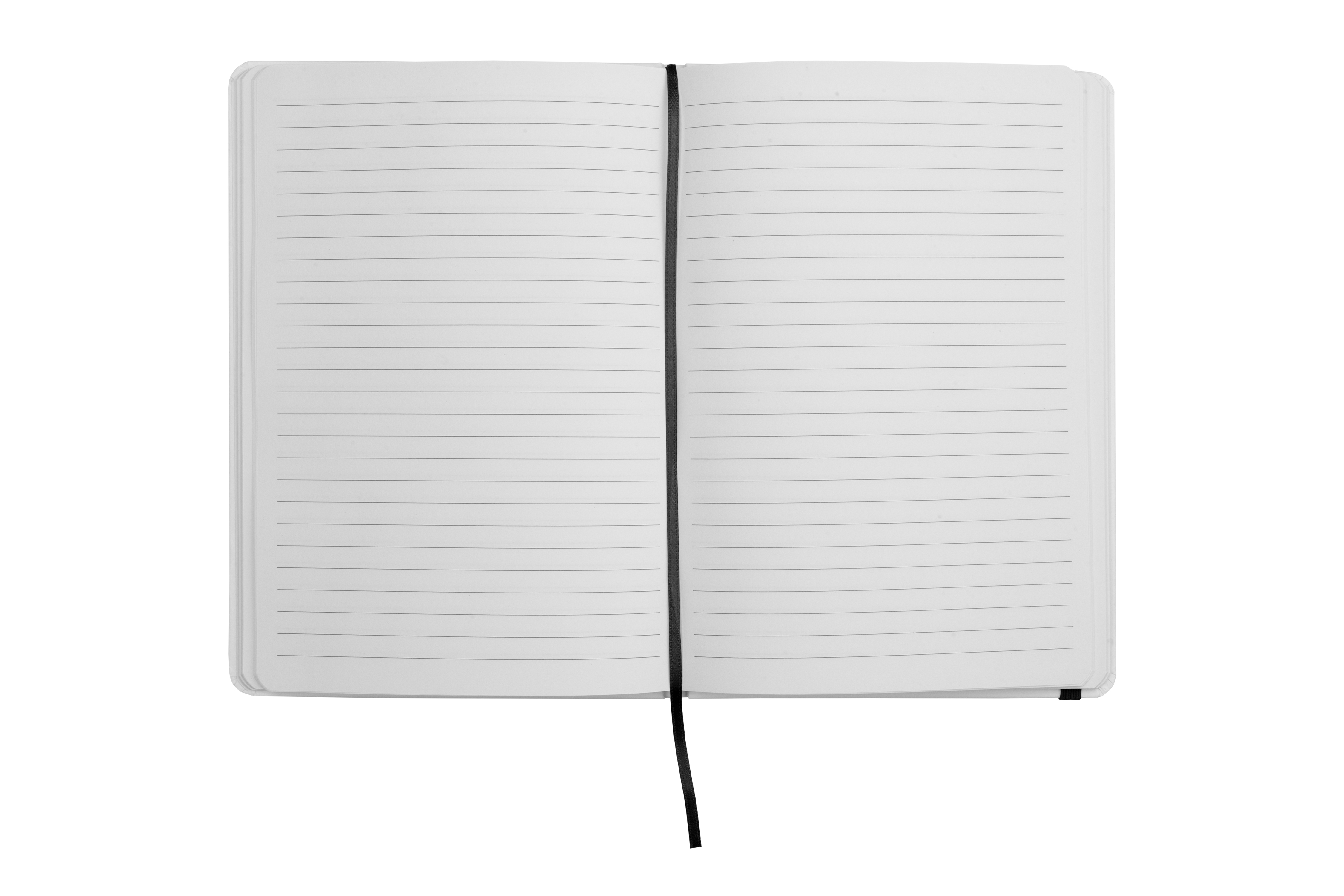 21 x 14,5 x 1 cm. Libreta de tapa dura color blanco. 80 hojas rayadas, cinta marcadora de páginas y cierre con banda elástica del mismo color.