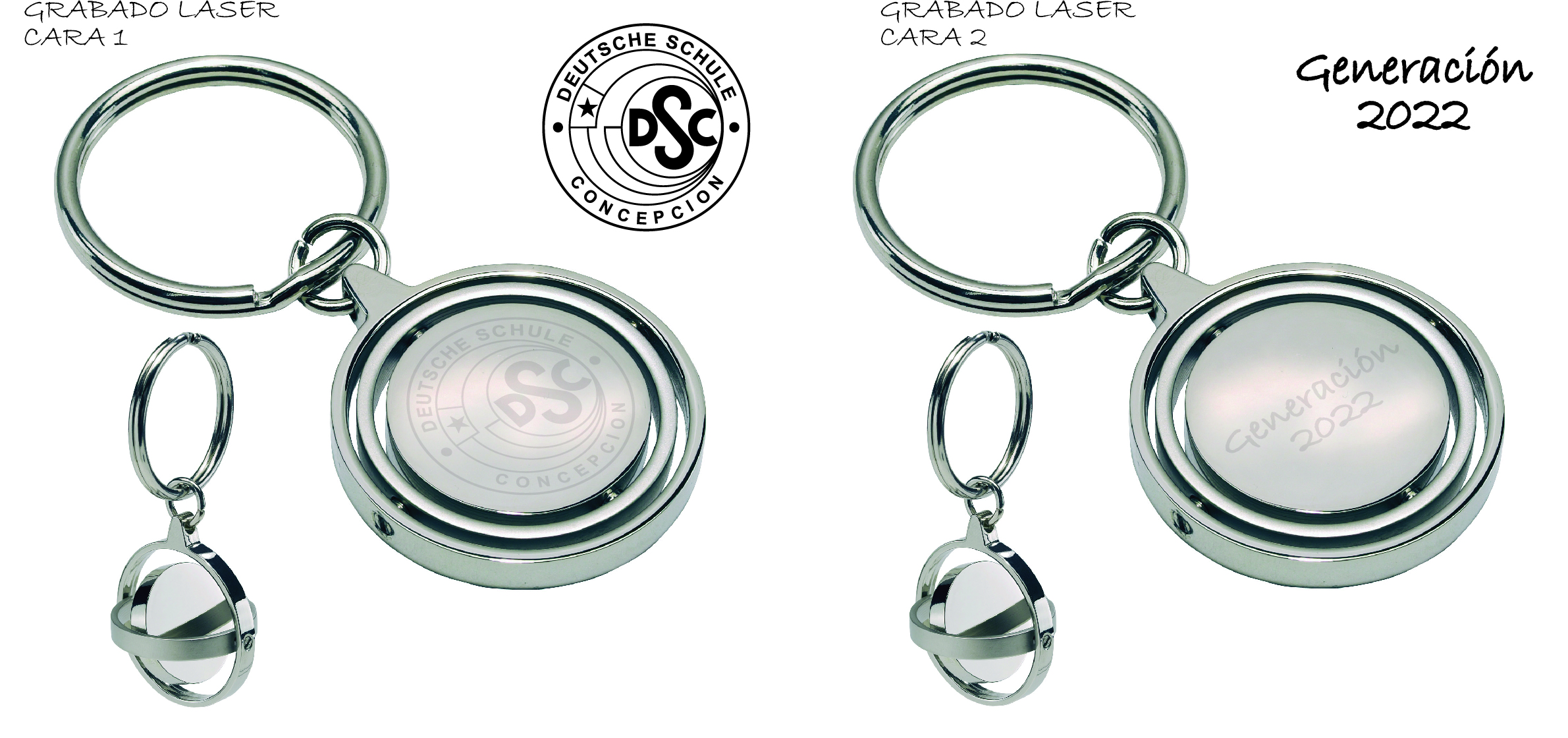 LLavero metálico Giratorio grabado laser ambos lados. Técnica de grabado especial para articulos publicitarios de metal, se logra un acabado elegante y nítido para tu logo o mensaje comunicacional.