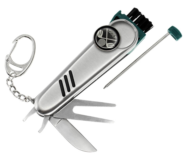 Llavero Gof acero inoxidable, cortaplumas, 7 funciones con levanta pique, presentación con caja de regalo plateada.