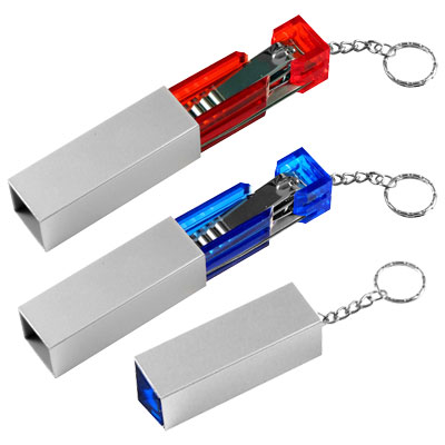 Set de Manicure con Llavero, en tubito rectangular plateado. Disponible en color rojo y azul.Tamaño: 6.5 x 2.1 x 2.1 cm.
