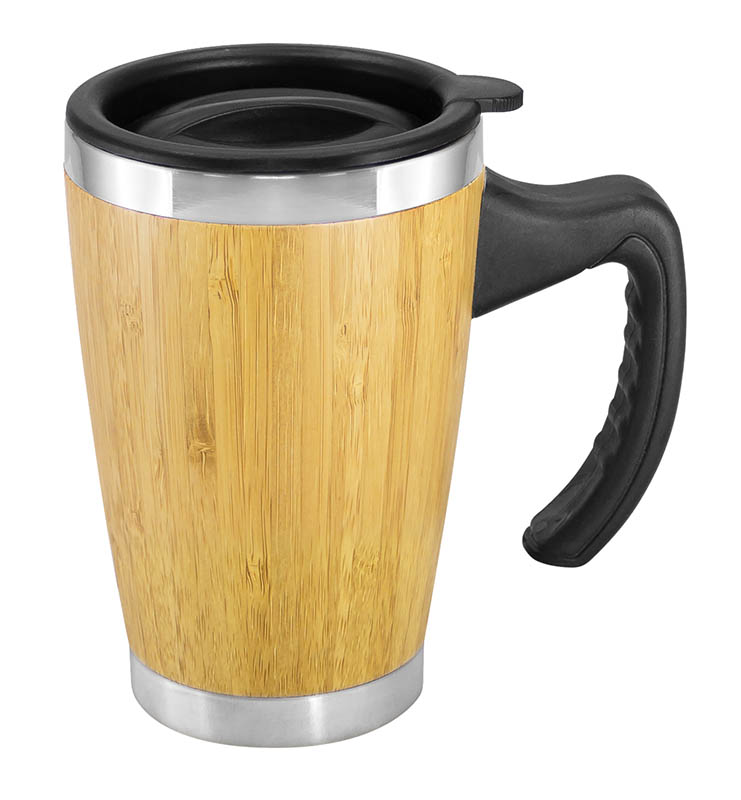 Mug de madera de Bamboo, con asa plástica negra, interior de acero inoxidable. Tapa plástica negra con dosificador. Presentación en caja de cartón