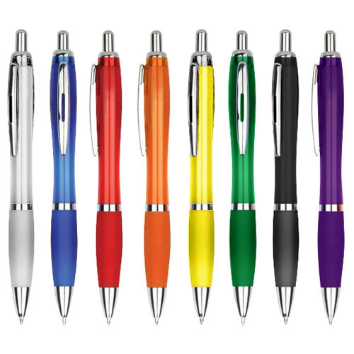 Lápiz publicitario modelo Mediterráneo Tornasol. Cuerpo curvo, retráctil, Grip de goma. Impresión en serigrafía.