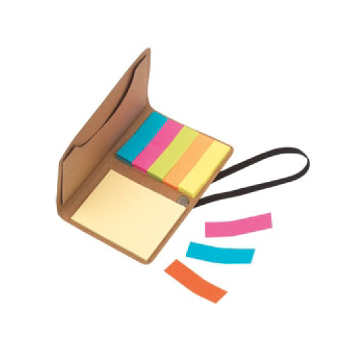 Libreta tapas cartón reciclado, 10,4 x 6,8 x 0,6 cm, 1 block autoadhesivo rectangular grande. 5 blocks autoadhesivos rectangulares chicos. Bolsillo interno. Cierre con banda elástica.
