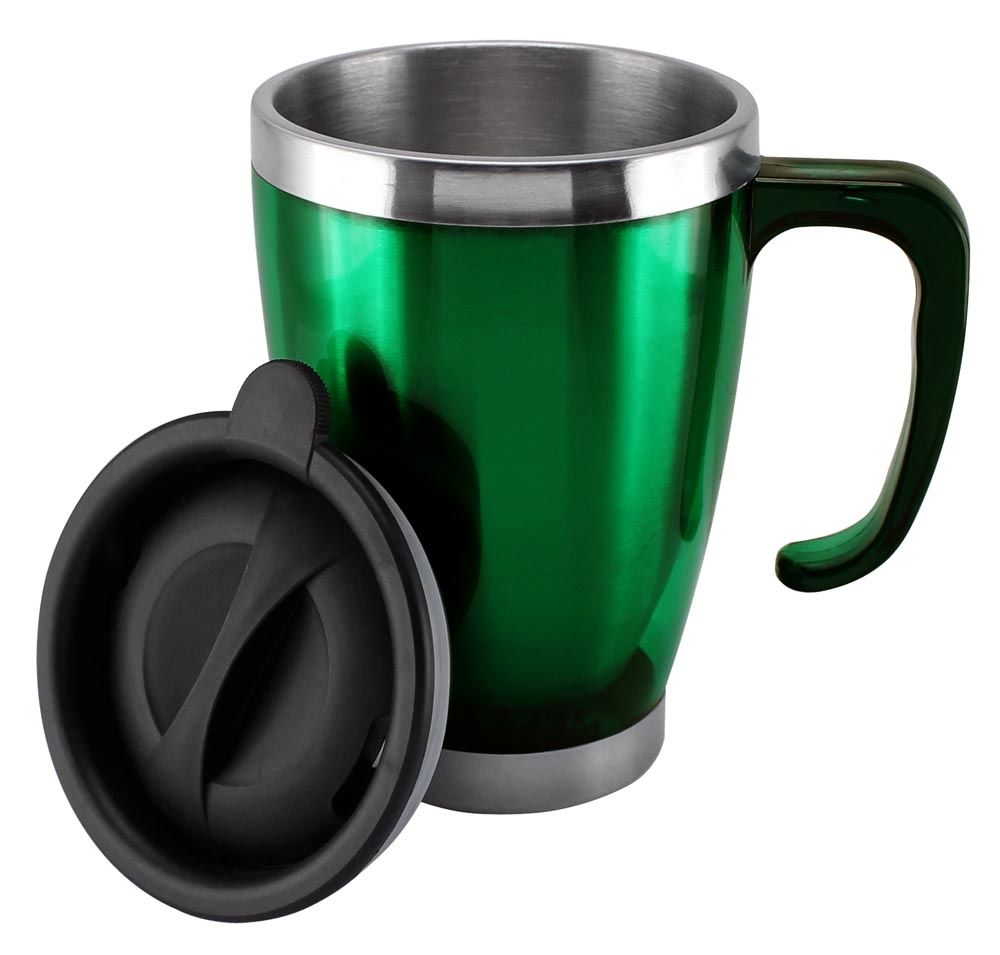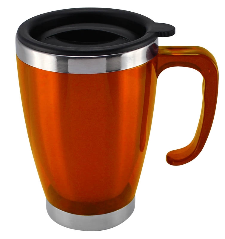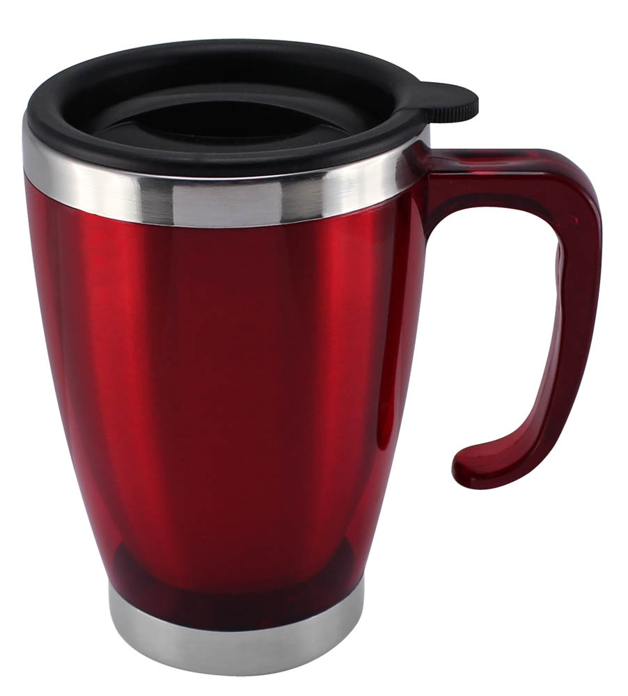 Mug térmico cónico 440 cc. de doble pared aislante con tapa pull-up de PVC negro y dosificador. Base interior de Acero Inoxidable y pared exterior de PVC.