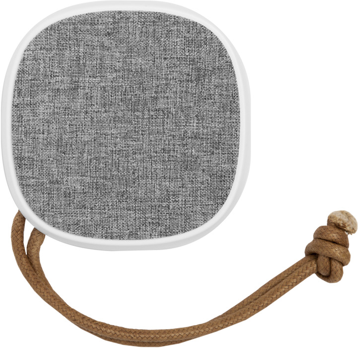 Medidas 9 x 9 x 4,4. Material plástico. Parlante bluetooth cubierto en tela. En la parte inferior engomado antideslizante con botones para encender o apagar, play/pausa y responder llamadas. Botón de retroceso y avance, este último, si se mantiene presionado durante unos segundos pasa a la siguiente pista, estos mismos botones permiten aumentar o bajar el volumen. Entrada USB, incluye cable. Lazo de tela color marrón que permite colgarlo. Alcance 10 mts. aprox. Duración de la batería 8 – 12 hs aprox. Incluye caja para guardar