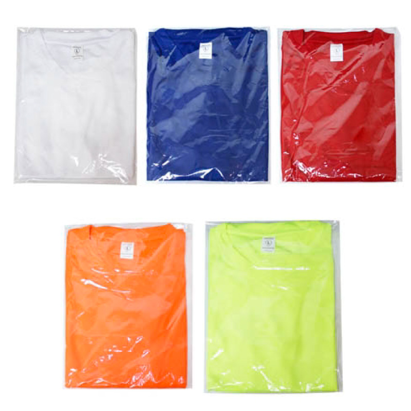 Polera 100% poliéster 150 grs. Para hombre cuello V manga corta, tallas XS a XXL, colores : blanco azulino, rojo, naranjo fluor, amarillo fluor