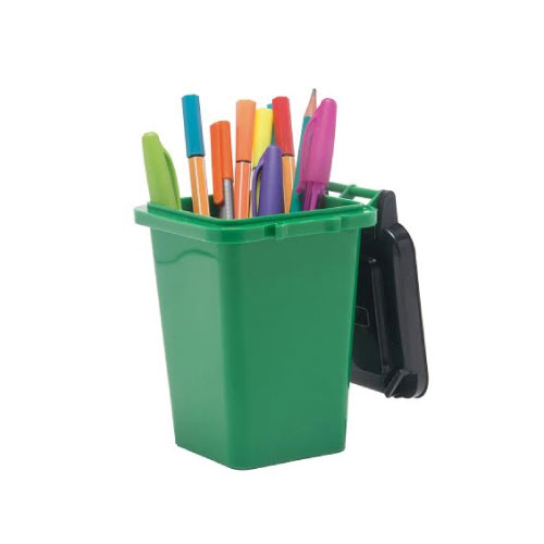 Portalápiz forma de contenedor de basura, plástico, 13 x 10 cms.