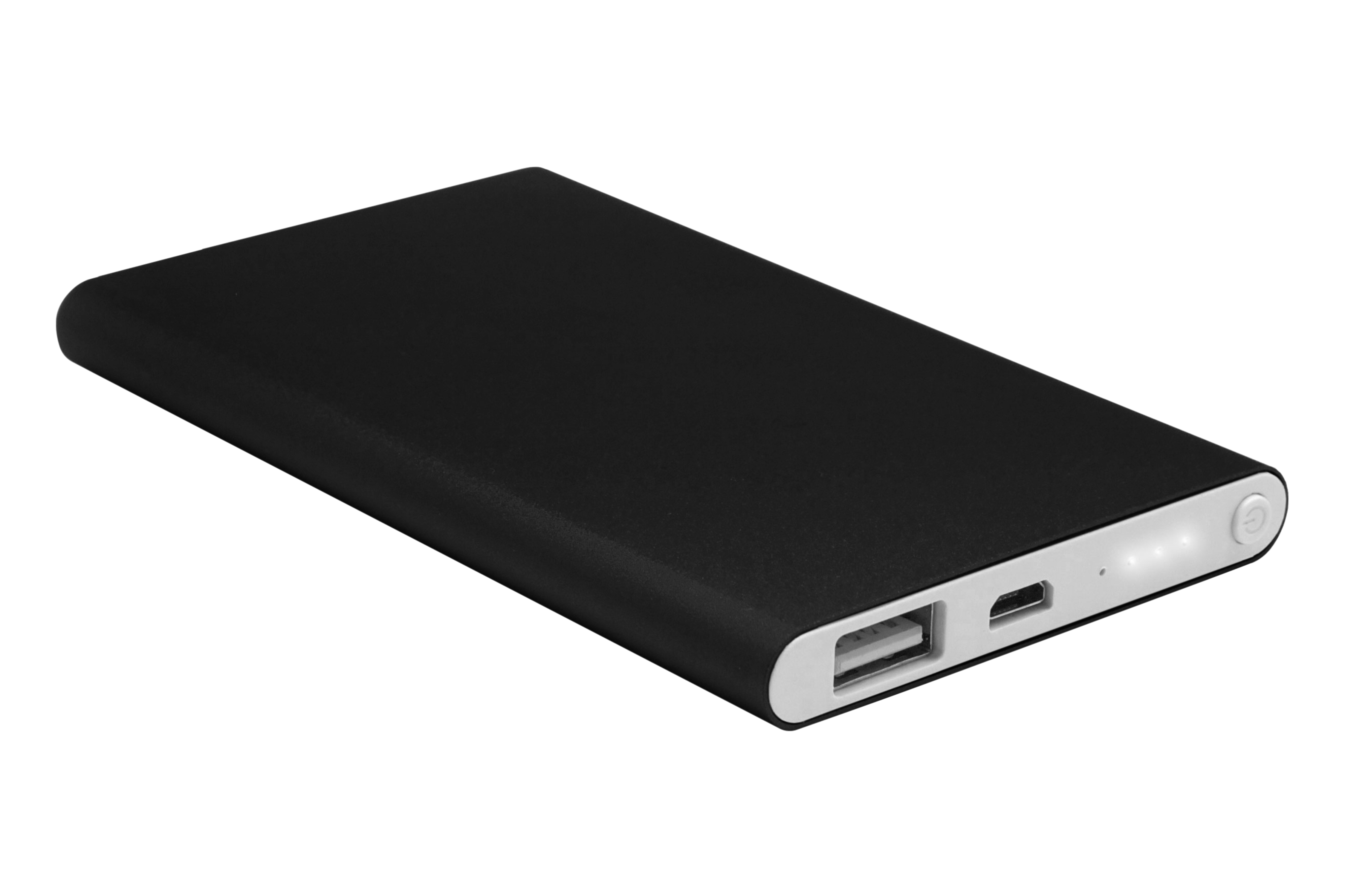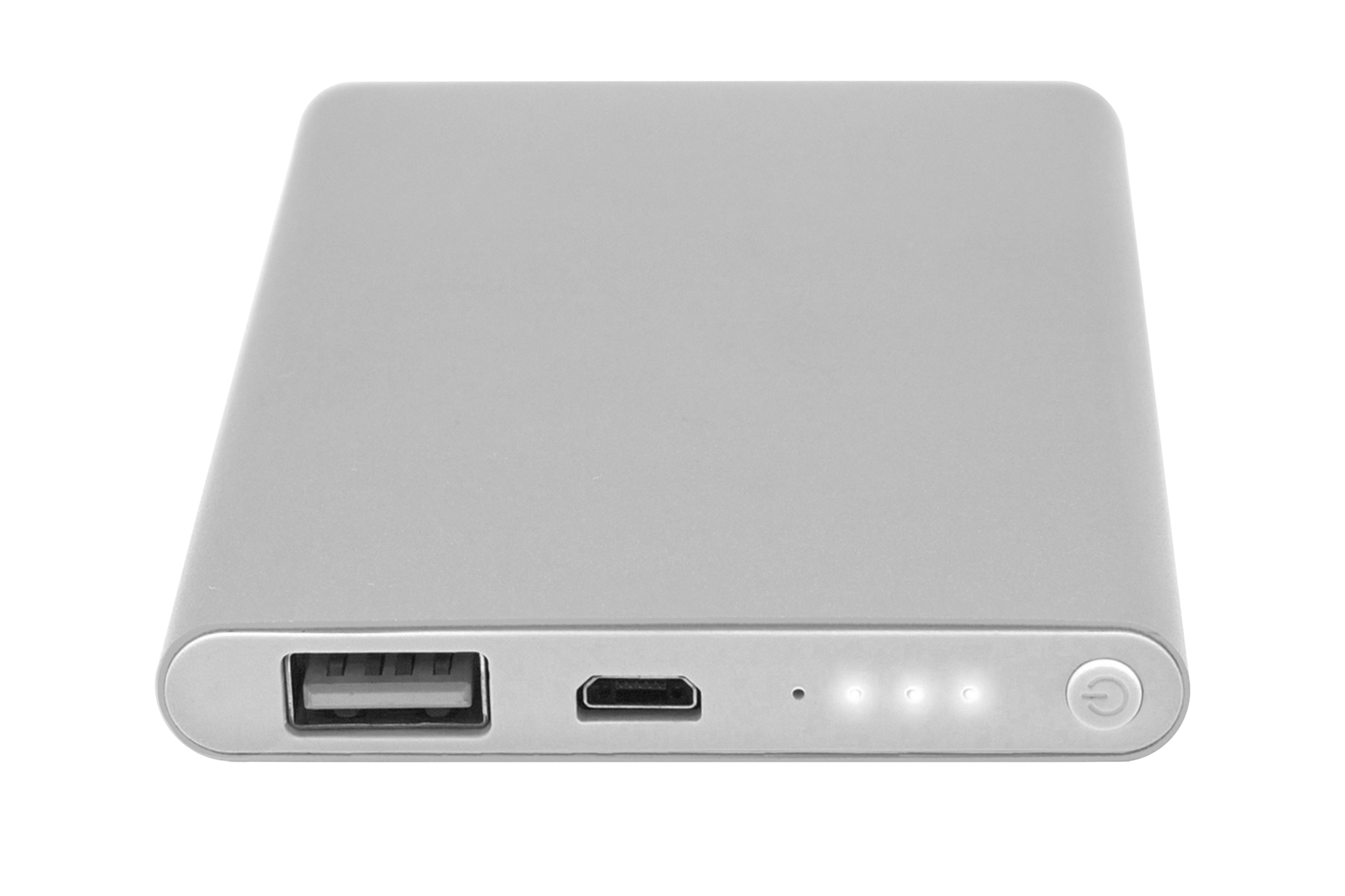 Tamaño 11 x 6,5 x 1 cm. Capacidad 4000 mah. Metálico. Power Bank. Cuerpo de color. Dos entradas: una USB y una mini USB. Botón de encendido y luces led indicadora de carga.