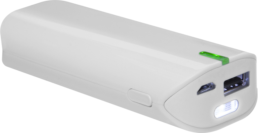 Plástico. Capacidad 5200 Mah. Power Bank con linterna. Cargador móvil. Luz led indicadora de carga, según la carga va cambiando el color. Botón que presionando comienza la carga de un dispositivo y presionando dos veces se enciende la linterna.