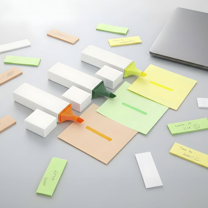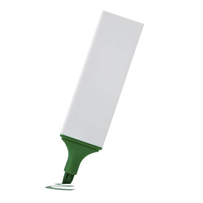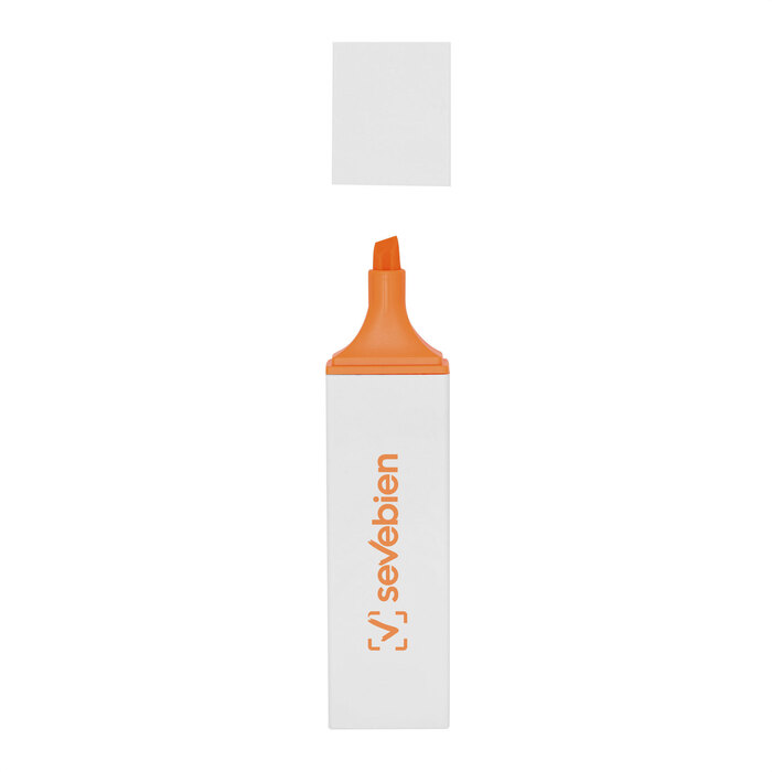 Marcador resaltador. Estructura rectangular plástica color blanco con amplia area de impresión. Punta biselada y puntera del color de la tinta.