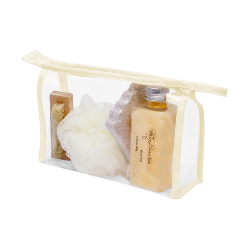 Estuche de plástico para baño, contiene : esponja malla, piedra pómez, escobilla doble, frasquito de sales relajantes.