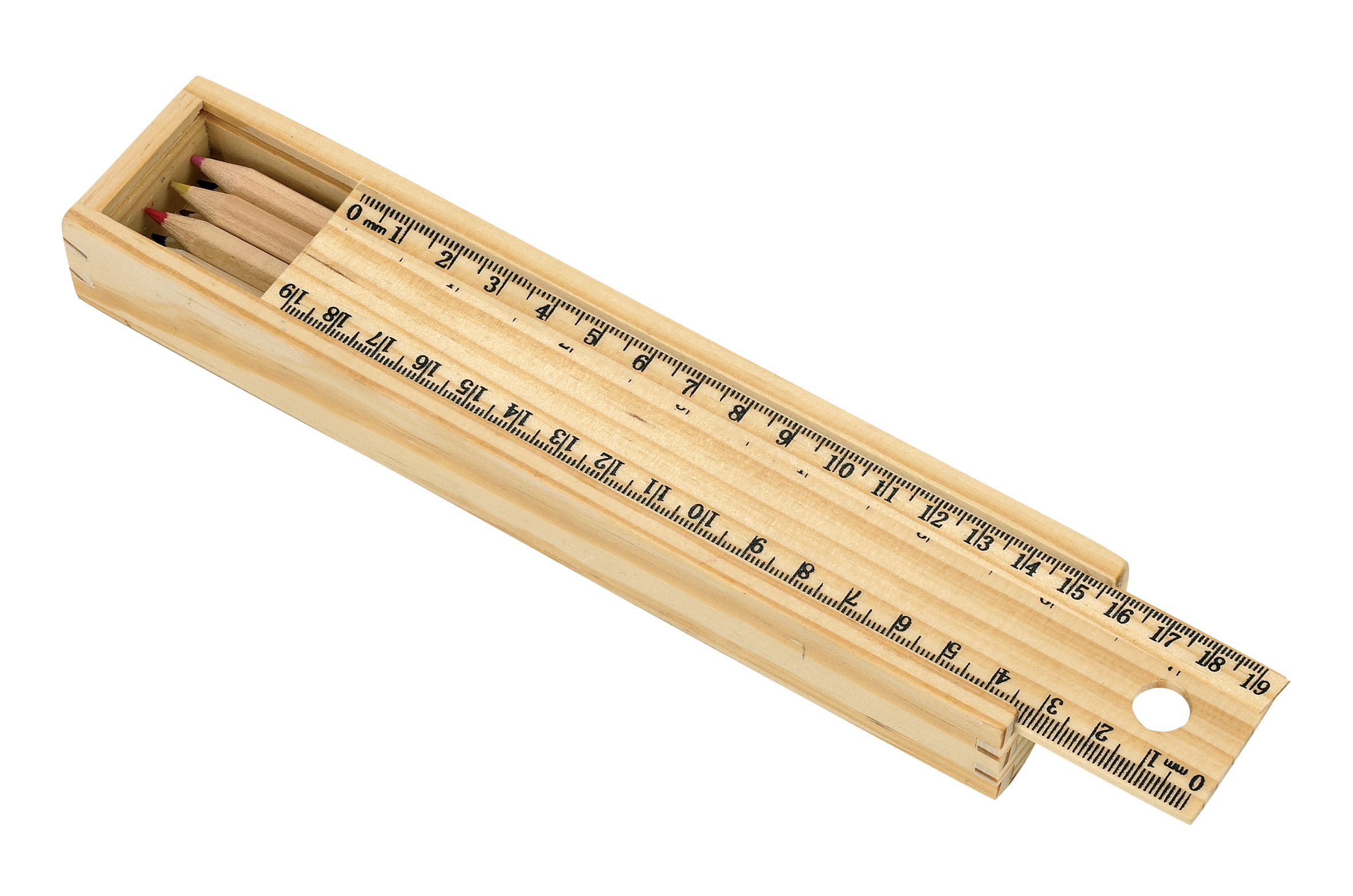 Set de 8 lápices en colores en caja de madera. Tapa con regla incluida. Tamaño 20,2 x 2,5 x 4,2 cm