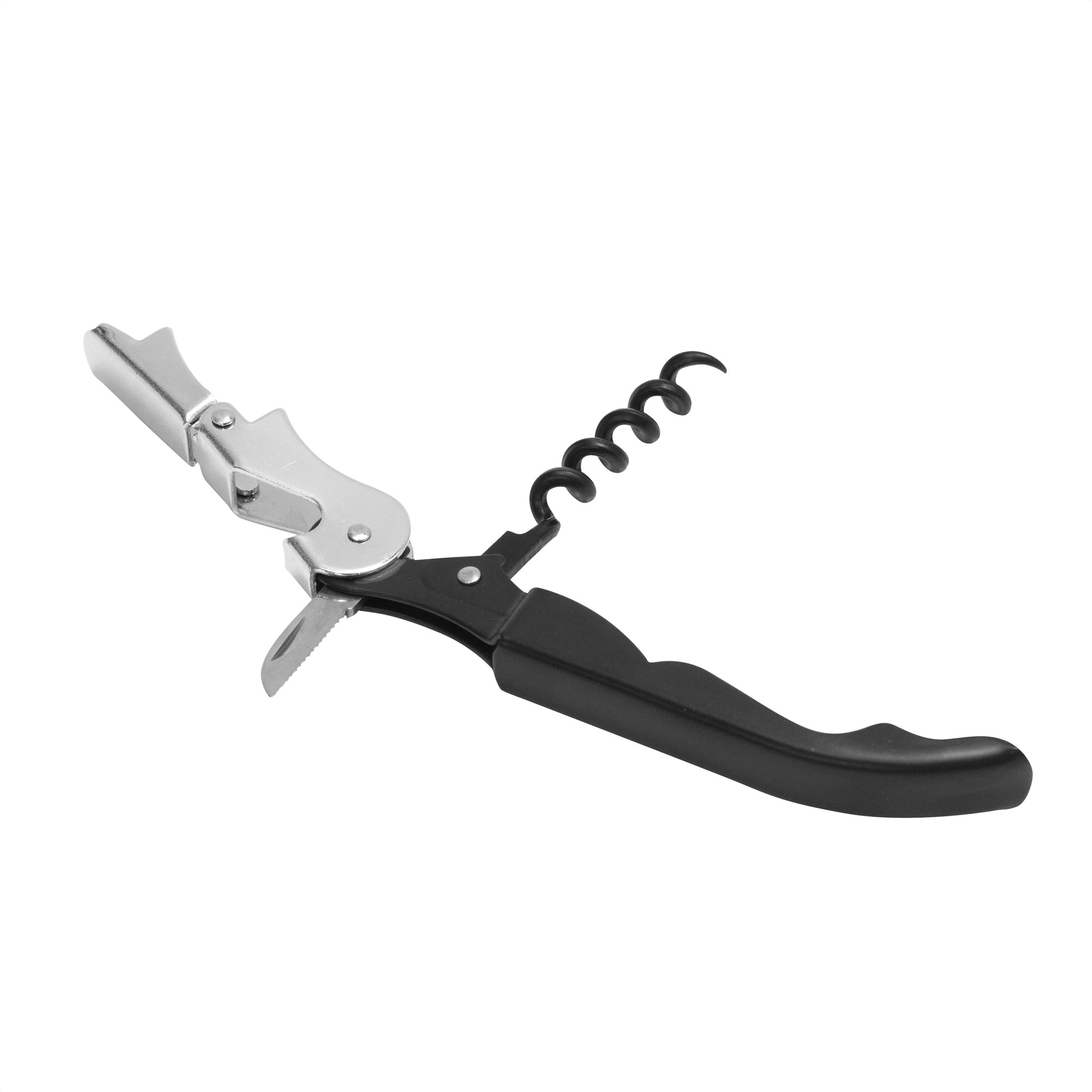 Capacidad 350 ml. cada copa. Vidrio + Acero inoxidable. Set de 2 copas para vino y sacacorchos. Abridor de botellas en acero inoxidable 430 + acero cromado con acabado negro mate. Presentación en caja de regalo kraft. Medidas 7,4 x 20 cm.