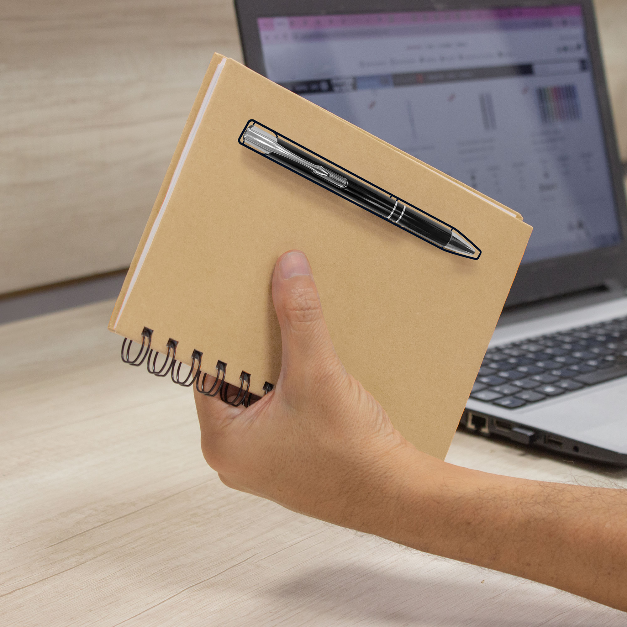 Tamaño 13 x 18 cm. Libreta color Kraft, anillado metálico y 70 hojas punteadas de 70g. Bolígrafo metálico color negro con tinta negra. Mediante sistema de imanes el bolígrafo queda sujeto a la tapa, causando un efecto sorprendente. Regalo original y práctico ideal para mostrar su logo y/o marca,