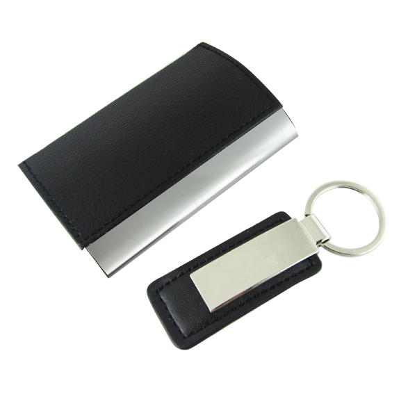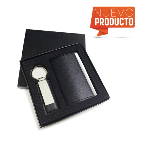 Set para regalo compuesto de tarjetero y llavero metal con eco cuero , grabado laser, presentación estuche cartón.