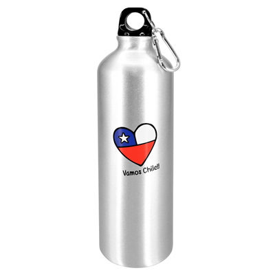 Sport Bottle Aluminio Vamos Chile 750 cc Tapa rosca y mosquetón para colgar, con gráfica tricolor. Colores: Blanca y plata.