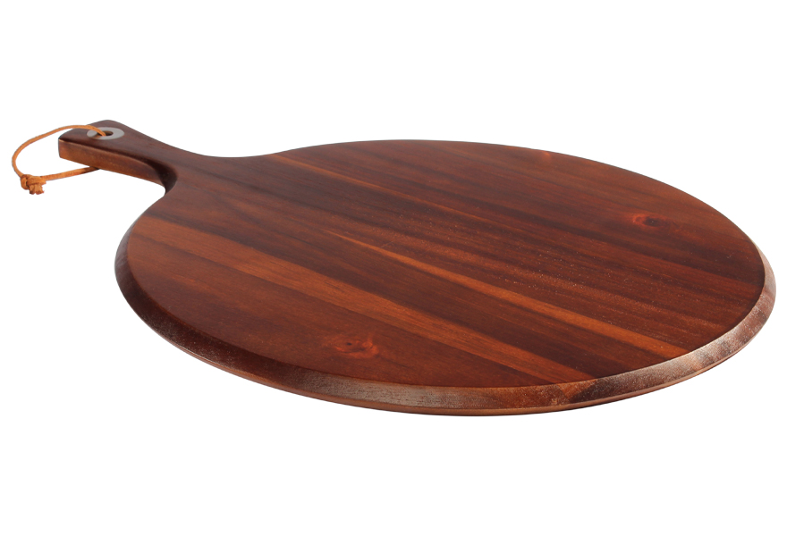 Amplia tabla redonda de madera sólida de ACACIA, con asa, ideal para cortar y servir Pizza. También para verduras y/o selección de quesos. Madera trabajada y acabada en máquina, de forma 100% regular, con superficies y cantos lisos y suaves, para una mayor higiene y comodidad al momento de cortar y servir alimentos. La Acacia, junto con la Teca, es considerada la mejor, más dura y más resistente madera para utilizar para cortes de alimentos – Densidad aprox. 770kg/m3. – Dureza 9.5 (test de Monnin) Tamaño 47 x D36 x 1,5 cms. aprox.