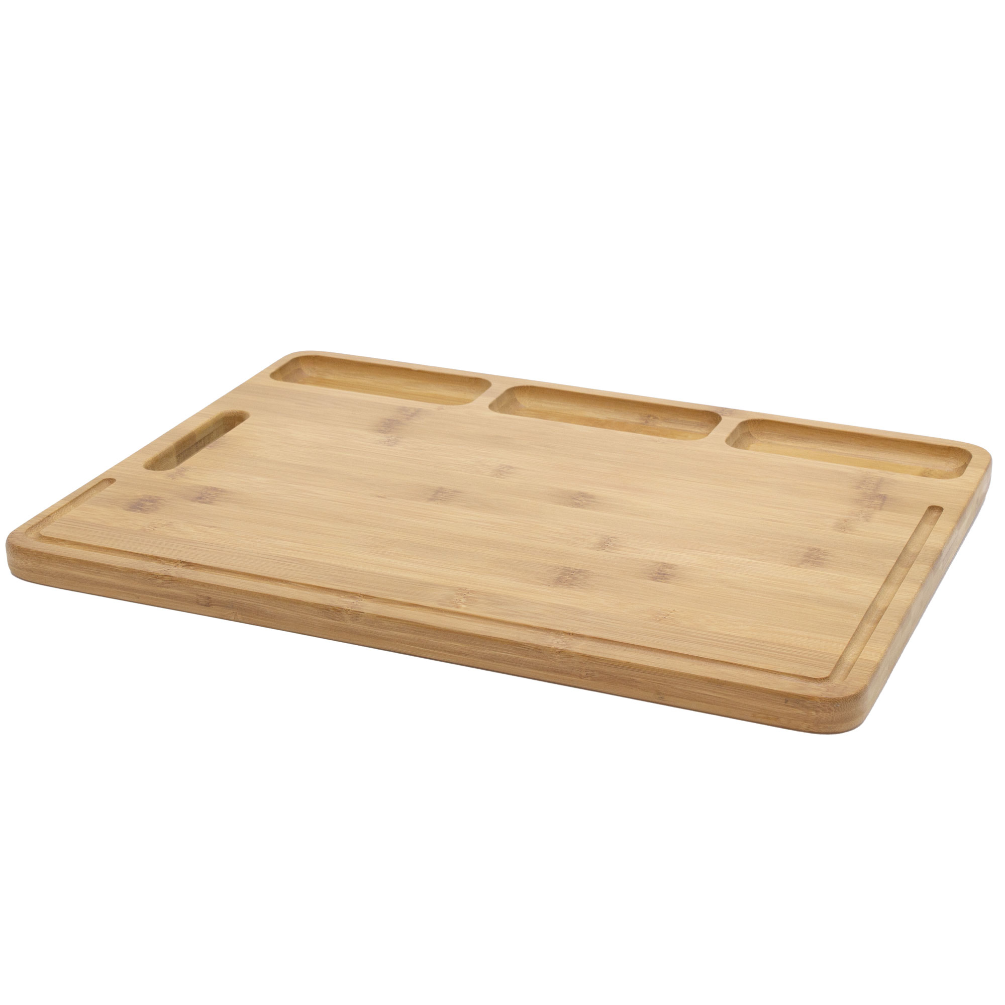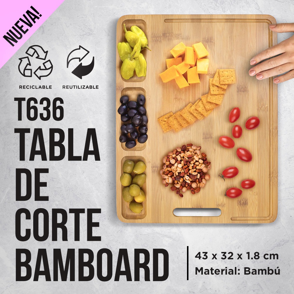 Tamaño 43 x 32 x 1.8 cm. Tabla de corte en Bambú. Tres compartimentos para armar snaks . Transportable con manija incluída. Presentación en caja de regalo.